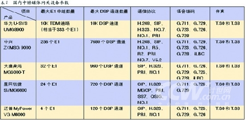 結(jié)合表2中的數(shù)據(jù),可以看出國內(nèi)中繼媒體網(wǎng)關(guān)設(shè)備制造商的定位非常類似于軟交換設(shè)備的市場定位,從設(shè)備支持的最大E1數(shù)和最大DSP通道數(shù)來看,華為和中興的中繼媒體網(wǎng)關(guān)主要是面向運營商客戶,不難發(fā)現(xiàn)網(wǎng)關(guān)支持的協(xié)議也最為豐富,能夠滿足和運營商不同協(xié)議體系網(wǎng)絡(luò)互通的需要。而大唐高鴻、星網(wǎng)銳捷和邁普的中繼媒體網(wǎng)關(guān)主要定位在企業(yè)行業(yè)客戶。