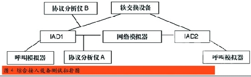 我國通信行業(yè)國家標準《基于軟交換的綜合接入設(shè)備測試方法》中明確了IAD設(shè)備九個大項的測試,分別是基本功能測試、協(xié)議測試、接口測試、話音業(yè)務測試、數(shù)據(jù)業(yè)務測試、性能測試、OAM測試、硬件項目測試和環(huán)境測試。按照圖4所示的測試拓撲圖進行連接,就可以按照測試方法中的測項要求,逐一得出測試結(jié)果。