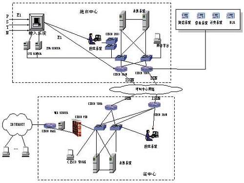 1924和中心交換機(jī)互聯(lián);在廣域網(wǎng)上,各地市和省中心通過2M DDN線路實現(xiàn)互聯(lián),通過ISDN線路實現(xiàn)線路備份,考慮到WEB受理的需要,全省呼叫中心系統(tǒng)設(shè)置統(tǒng)一的WEB服務(wù)器,設(shè)在省中心,通過CISCO