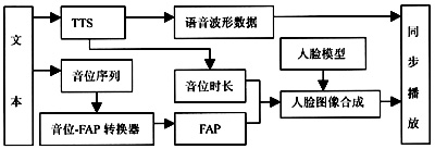 FAP一共有68個(gè)參數(shù),包括兩個(gè)高級(jí)參數(shù)和66個(gè)低級(jí)參數(shù)。高級(jí)參數(shù)是視位(viseme)和表情(expression),視位分為15個(gè),分別表示人們發(fā)某一音位時(shí)的面部動(dòng)作;表情分為高興、悲傷、憤怒、害怕、厭惡、驚奇六種。66個(gè)低級(jí)參數(shù)用來(lái)控制部分FDP特征點(diǎn)的運(yùn)動(dòng),進(jìn)而形成各種復(fù)雜的人臉動(dòng)作。這些標(biāo)準(zhǔn)的制定極大地推動(dòng)了參數(shù)控制合成方法的發(fā)展,使這種方法在人機(jī)交互、計(jì)算機(jī)網(wǎng)絡(luò)交談、游戲動(dòng)畫(huà)等方面得到更為廣泛的應(yīng)用,圖2 是參數(shù)控制的TTVS系統(tǒng)的基本框架。