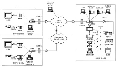 由于政府部門(mén)所跨的地域較廣,彼此之間的距離較遠(yuǎn),而且各級(jí)政府部門(mén)的會(huì)議較多,因此,利用修建好的信息高速公路建立一個(gè)基于IP網(wǎng)絡(luò)的視像會(huì)議系統(tǒng)具有一定的實(shí)用價(jià)值。這種系統(tǒng)既可以提高政府部門(mén)的辦公效率以及政府專(zhuān)用網(wǎng)絡(luò)的利用率,又可以節(jié)省政府部門(mén)的會(huì)議費(fèi)用。以下介紹在IP寬帶網(wǎng)上構(gòu)建電視電話會(huì)議系統(tǒng)解決方案。