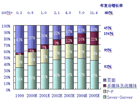 同時(shí),人們對(duì)P-P的互動(dòng)及多媒體的傳輸?shù)男枨髮⒊蔀榫W(wǎng)絡(luò)使用的2個(gè)最主要的發(fā)展趨勢(shì)。據(jù)麥肯錫公司和JP摩根的分析和預(yù)測(cè),多媒體及流媒體的IP流量將以每年154%的復(fù)合率增長(zhǎng),而P-P的IP流量將以95%的年復(fù)合增長(zhǎng)率增長(zhǎng),這2項(xiàng)將成為用戶需求增長(zhǎng)最快的業(yè)務(wù)。如下圖,