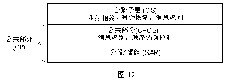 ATM適配層,是ATM核心(包括ATM層和物理層,與業(yè)務(wù)無(wú)關(guān))和高層間的接口(見(jiàn)圖5),它是為使ATM層能適應(yīng)不同業(yè)務(wù)類型而設(shè)置的,故ATM對(duì)各種業(yè)務(wù)承載能力集中體現(xiàn)在ATM適配層。ATM適配層又細(xì)分為若干子層。具體如下圖12。