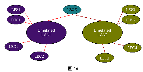 每個ELAN(Emulated LAN)由一組LANE客戶(LEC)和LANE服務(wù)構(gòu)成。LEC還可以是作為ATM主機(jī)代理的網(wǎng)橋和路由器。LE服務(wù)由三個不同的功能實體構(gòu)成:LAN仿真配置服務(wù)器(LECS)、LAN服務(wù)器(LES)和BUS,這三個服務(wù)實體可以各自存在,但通常位于同一設(shè)備,例如:LES可以位于ATM交換機(jī)、路由器、網(wǎng)橋和工作站。ATM LANE的構(gòu)成及相互關(guān)系如下圖16所示: