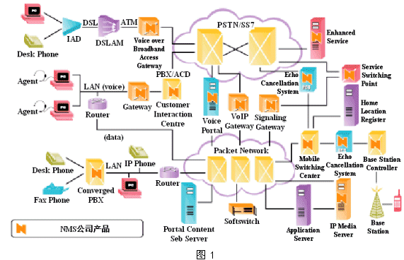 其具體技術(shù)內(nèi)容包括:語音IP (VoIP)、語音DSL (VoDSL)和語音無線本地環(huán)路(VoWLL);以及用于確保IP語音、視頻和數(shù)據(jù)通信性能的其他技術(shù)。圖1顯示了NMS公司的產(chǎn)品在整個通信應(yīng)用(包含PSTN網(wǎng)絡(luò)和IP分組網(wǎng)絡(luò))中的位置。