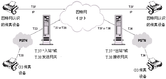 在T.37術(shù)語(yǔ)中,因特網(wǎng)傳真(Ifax)設(shè)備能夠通過(guò)一個(gè)出站設(shè)備向傳統(tǒng)連接到PSTN的傳真機(jī)發(fā)傳真,或者通過(guò)一個(gè)IP網(wǎng)直接發(fā)送到另一個(gè)因特網(wǎng)傳真(Ifax)設(shè)備。