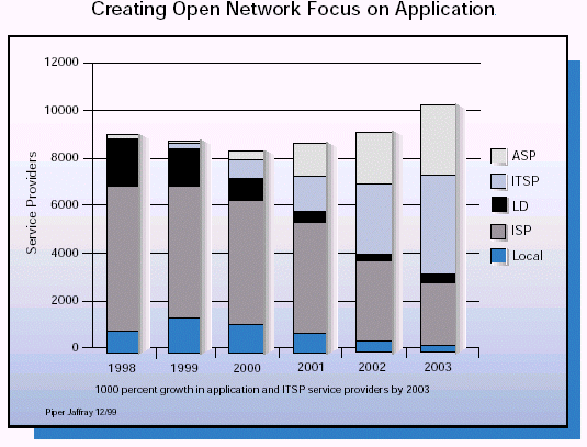任何一個(gè)網(wǎng)絡(luò)的核心都是光纜和讓網(wǎng)絡(luò)工作起來的底層交換設(shè)備。傳統(tǒng)的業(yè)務(wù)提供商就是那些擁有這種底層設(shè)備的公司。但是打破傳統(tǒng)的語音環(huán)境為那些沒有這些底層設(shè)備的組織打開了向商業(yè)客戶和消費(fèi)者提供服務(wù)的大門。這種趨勢(shì)--網(wǎng)絡(luò)傳輸從電路交換轉(zhuǎn)變?yōu)榉纸M交換以及隨時(shí)可得的基于開放部件的劃算的業(yè)務(wù)平臺(tái)--使得這些新的業(yè)務(wù)提供商為自己的業(yè)務(wù)找到了商業(yè)機(jī)遇。