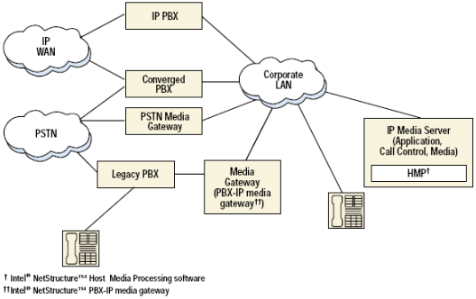 一個(gè)IP媒體服務(wù)器是在網(wǎng)絡(luò)中的終結(jié)IP連接的節(jié)點(diǎn). 根據(jù)客戶環(huán)境的不同(服務(wù)提供商或企業(yè)), IP媒體服務(wù)器可以用很多方法來實(shí)現(xiàn).