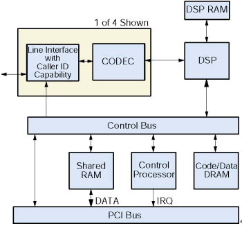一個(gè)板卡上的微處理器控制D/4PCIU和D/4PCIUF通過(guò)一個(gè)本地總線控制板卡所有操作,它從主機(jī)截獲和執(zhí)行命令。這個(gè)微處理器處理實(shí)時(shí)的事件,管理和主機(jī)交互的數(shù)據(jù)流,提高系統(tǒng)的反應(yīng)時(shí)間,減少主機(jī)處理的需求,傳遞給應(yīng)用程序之前處理DTMF和電話信令,把DSP解脫出來(lái)專門做信令處理。這個(gè)微處理器和主機(jī)的通信是通過(guò)一個(gè)共享RAM,它作為一個(gè)輸入/輸出緩沖區(qū)增加的磁盤文件傳輸?shù)男。這個(gè)RAM和主機(jī)的接口是PCI總線。為了滿足實(shí)時(shí)系統(tǒng)的要求,所有操作的是中斷驅(qū)動(dòng)的。所有安裝在PC里面的D/4PCIUF板卡共享同一個(gè)中斷。在系統(tǒng)初始化的時(shí)候,固件從主機(jī)下載到板卡上的代碼/數(shù)據(jù)
