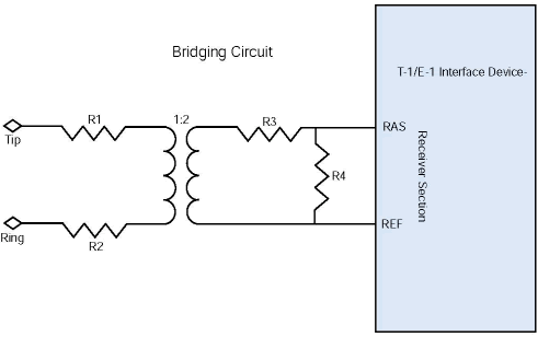 橋接電路的高阻抗大約是線路阻抗的10倍, (例如 T-1接口為1000 Ohm , E-1接口為1200 Ohm).