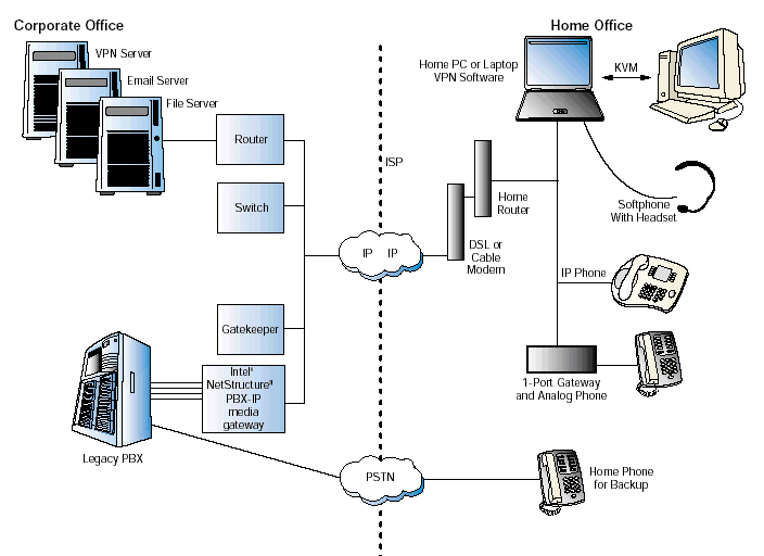 為了實現(xiàn)這個VoIP解決方案,PBX-IP網(wǎng)關連接到了辦公室里的原有的PBX和關鍵系統(tǒng)上,還有網(wǎng)守軟件實現(xiàn)一些呼叫的路由以及地址轉換。然后遠程辦公者連接到了網(wǎng)關上--最終連接到公司PBX上--或者使用IP軟電話,或者一個實際的IP電話,或者一個單端家庭網(wǎng)關連接到模擬耳機上。