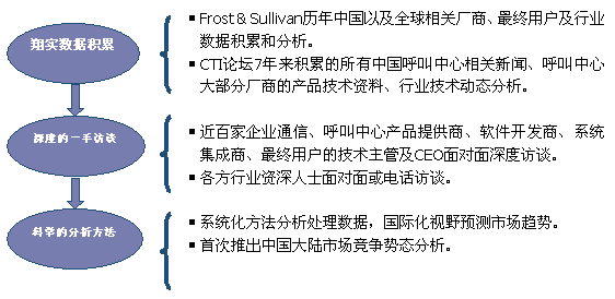 Frost & Sullivan 和 CTI論壇(www.jubaoshijie.com)共同組成的調(diào)研小組,在查閱了大量資料的基礎(chǔ)之上,以企業(yè)通信及呼叫中心的設(shè)備應(yīng)用、投資計劃以及相關(guān)廠商的市場表現(xiàn)為出發(fā)點,通過對企業(yè)通信及呼叫中心重要應(yīng)用企業(yè)、在市場占主導(dǎo)地位的二十多家設(shè)備廠商、二十多家軟件開發(fā)商、十幾家系統(tǒng)集成商、數(shù)家外包運營商的深度訪談,參閱內(nèi)部相關(guān)報告及數(shù)據(jù)庫,對數(shù)據(jù)的來源和數(shù)據(jù)的準(zhǔn)確性進(jìn)行了詳細(xì)核對與論證;憑借參與調(diào)研人員的多年從業(yè)經(jīng)